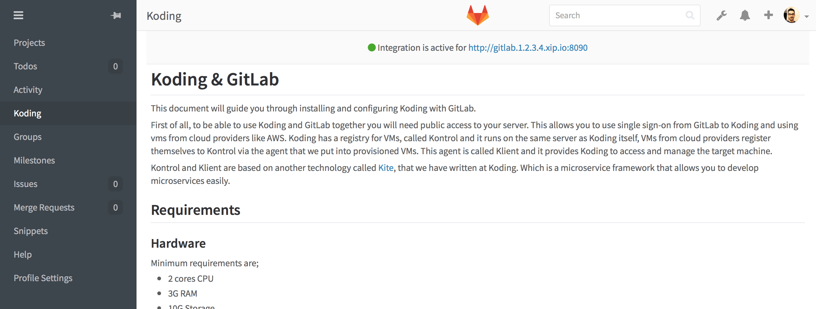 This document will guide you through using Koding integration on GitLab in detail. For configuring and installing please follow the administrator guide.